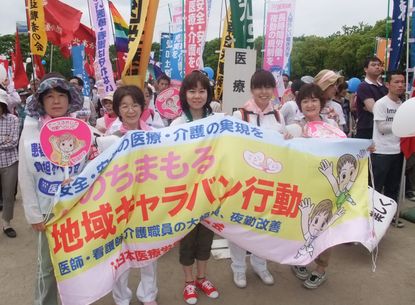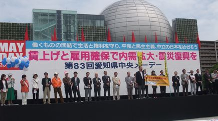 5月1日、第83回愛知メーデーが開催され、県下7会場に5千5百人が参加しました。名古屋市内は白川公園で愛知中央メーデーが開かれました。集会前は社保協の署名宣伝に20名が参加し増員署名に112筆を集約しました。集会後のデモ行進では白衣で元気よく名古屋駅納屋橋まで看護師ふやせ!と声を張り上げ歩きました。医療関係60名が参加しました。その後27名で交流会を行いました。