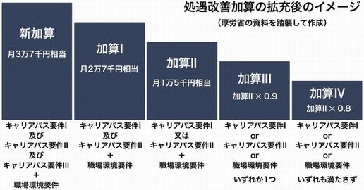 厚生労働省は11月16日、介護職員の賃金を平均月額1万円程度引き上げるため、来年4月から既存の「処遇改善加算」を拡充する方針を固めた。一定の基準にもとづき定期昇給させる仕組みを作り、経験や資格に応じて給料を上げていれば対象となる。これまでの要件は維持し、加算率の高い新たな区分を設けるとのこと。ただし加算率など詳細については1月下旬以降になる模様です。