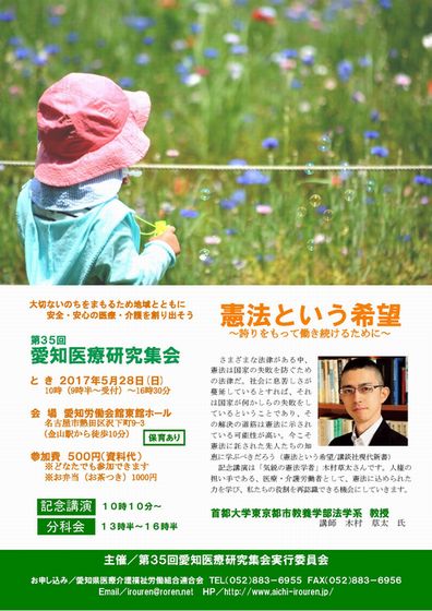 第35回愛知医療研究集会の記念講演は、「気鋭の憲法学者」木村草太さんです。憲法は、国家の失敗を防ぐための法律だとしています。人権の担い手である、医療・介護労働者として、憲法に込められた力を学びます。