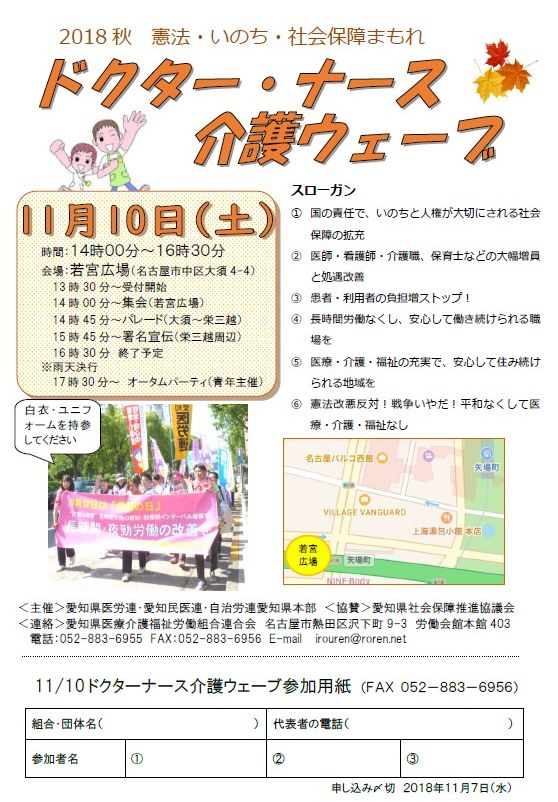 チラシ・申し込み用紙はこちら→PDF 11月10日(土)14時~16時半 会場:若宮広場(雨天決行) ※白衣・ユニフォームを持参してください。 ※17時半~青年主催のオータムパーティがあります。 参加希望の方は愛知県医労連までご連絡を☆