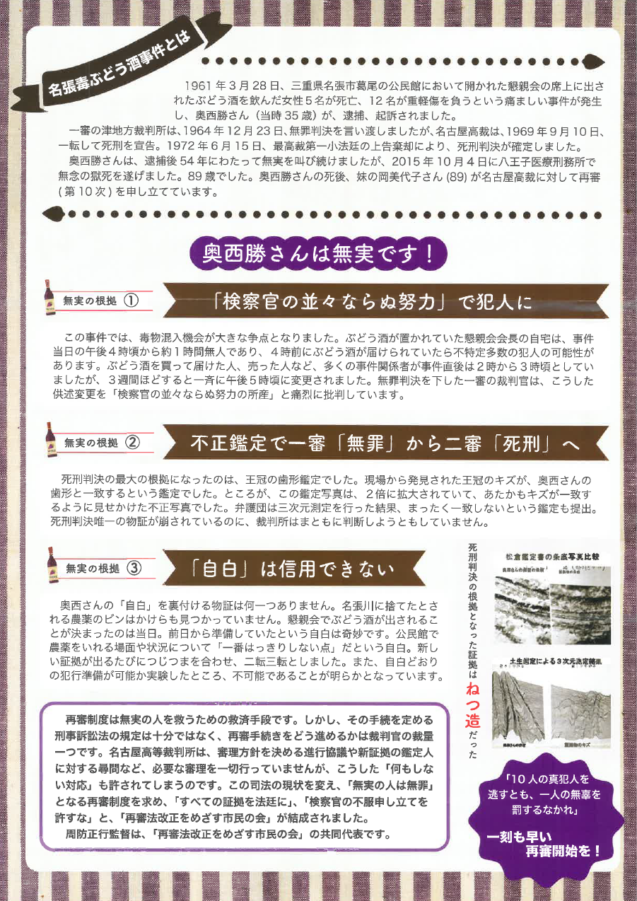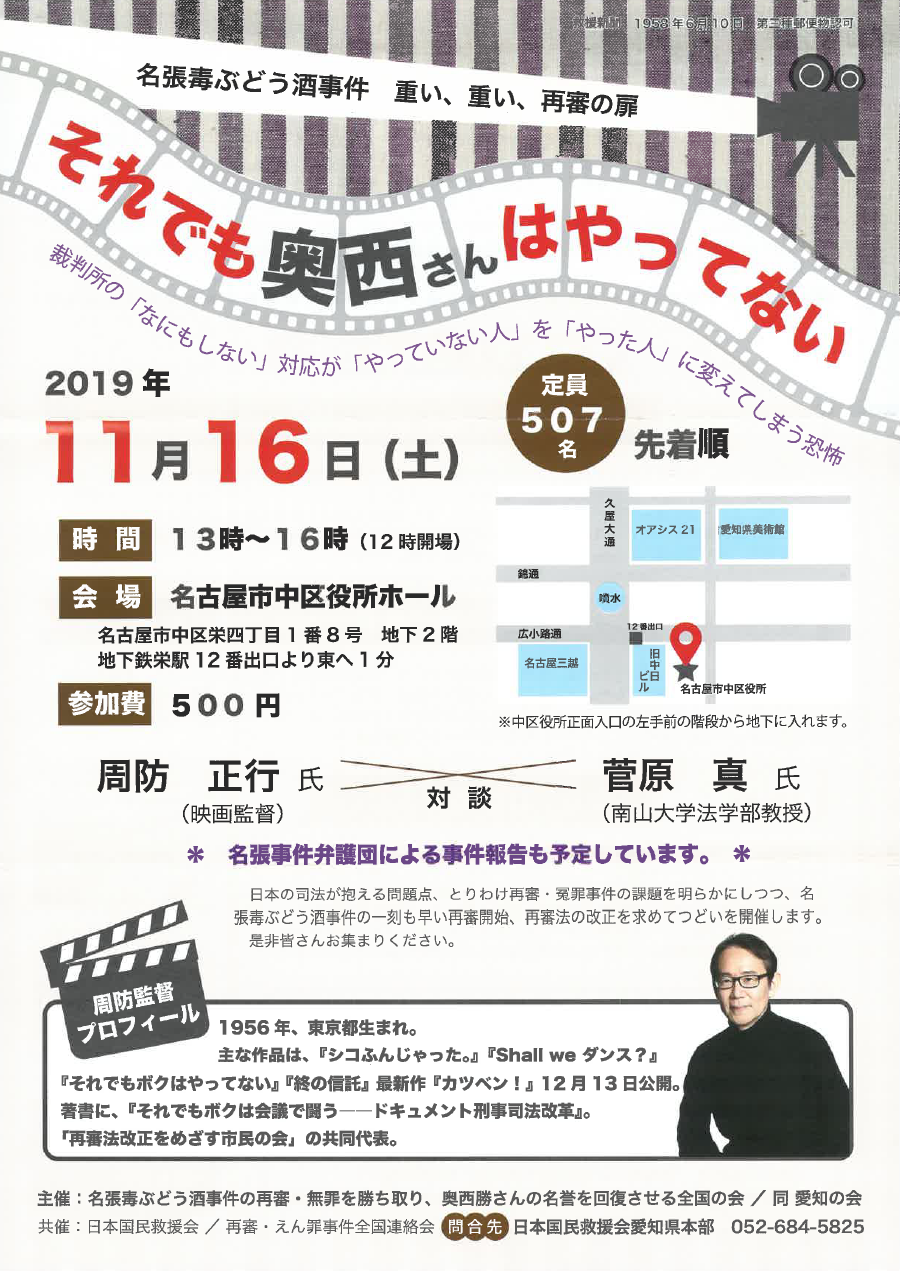 11.16(土) 名張毒ぶどう酒事件『それでも奥西さんはやってない』映画監督 周防正行氏対談イベントのご案内