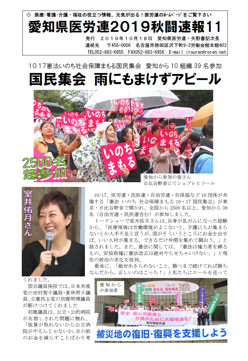 19秋闘速報⑪ 10.17憲法・いのち・社会保障まもる国民集会 雨にもまけず2500名でアピール!
